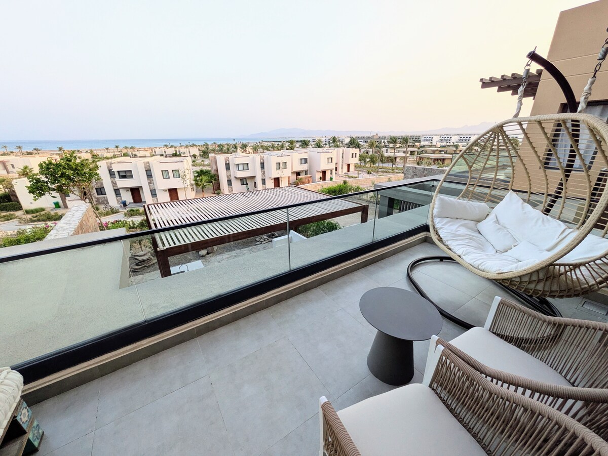 Apartamento moderno de estilo europeo con vistas al mar y a las montañas Todos los muebles están hechos a mano localmente. En la espaciosa terraza, puedes relajarte en las tumbonas y disfrutar de la vista panorámica del mar. El gran dormitorio con fantásticas vistas a las majestuosas montañas del desierto de Safaga ofrece mucho espacio y tranquilidad. La cocina está equipada con electrodomésticos de alta calidad. La amplia sala de estar con un sofá cama extraíble también ofrece vistas al mar.