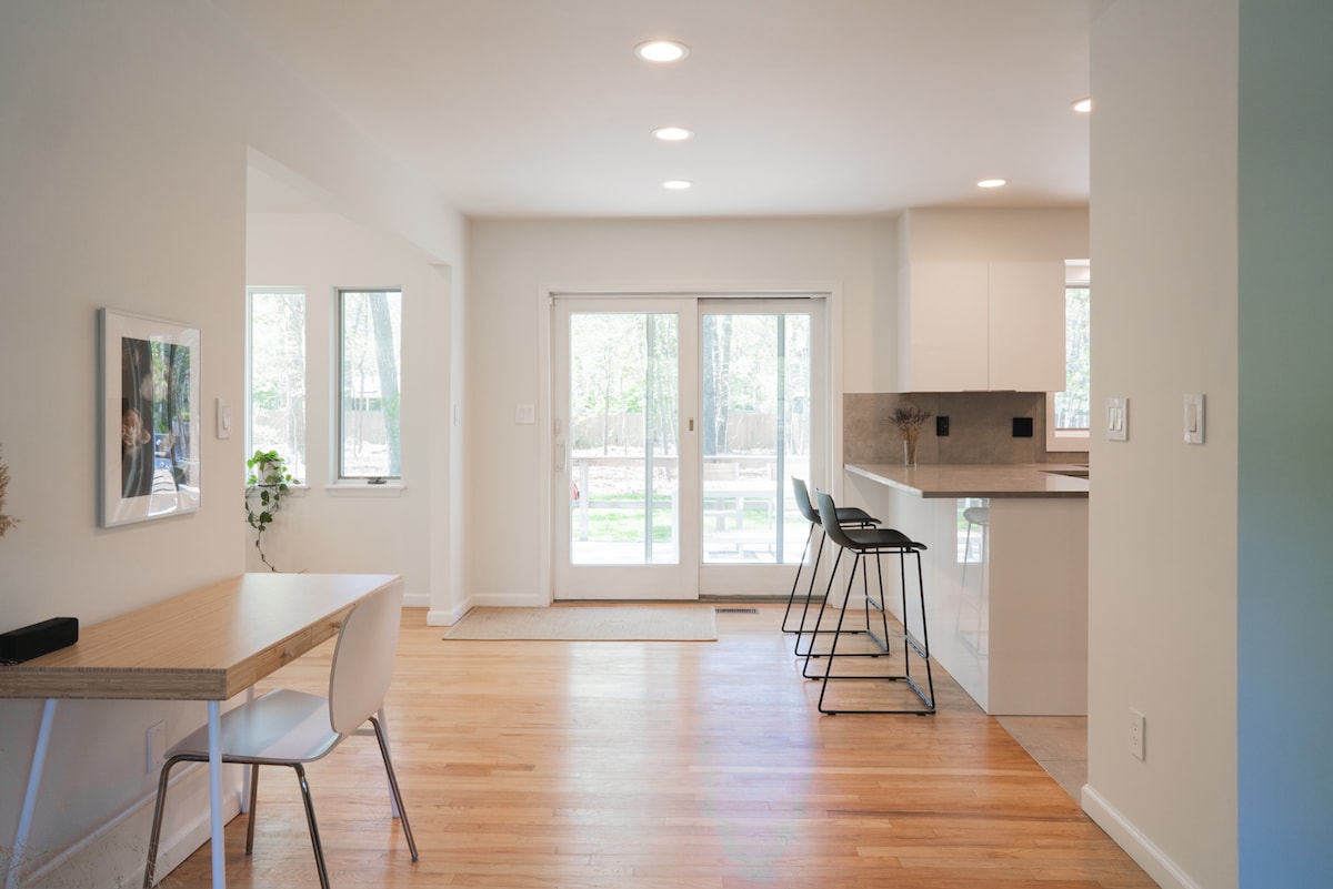Esta moderna casa de huéspedes en la playa tiene suelos de madera encalada, electrodomésticos de acero inoxidable nuevos, aire acondicionado central y está muy bien ubicada. Estamos a pocos pasos de East Hampton Village y a 1,9 millas de la playa más cercana. Hay un patio trasero privado con una ducha exterior de cedro y una sala de estar en un entorno sereno.
