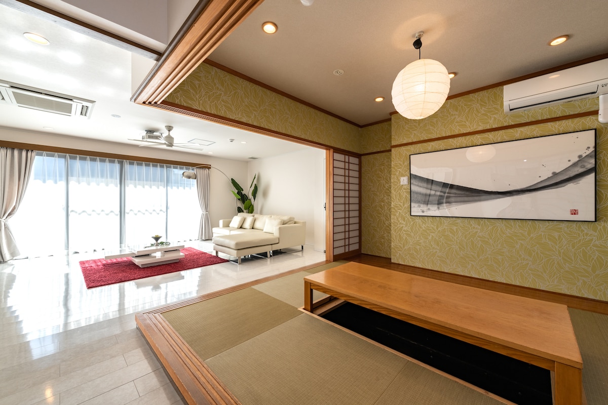 Cerca de la estación de Hakata | 180 m² | Ascensor y estacionamiento | 7 camas + 2 futones | Hasta 9 personas | Ideal para familias de tres generaciones y viajes en grupo