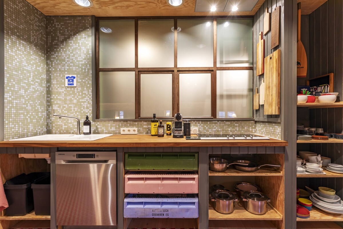 Das im Loftstil gebaute Appartment mit hochwertigen Möbeln und komplett ausgestatteter Küche sowie die beiden Badezimmer (eins davon en suite) sind mit Liebe zum Detail und Blick fürs Schöne eingerichtet. Entspannen Sie in der Infrarotkabine, die in einem der beiden jeweils mit 180x200 Boxspringbetten ausgestatteten Schlafzimmer steht oder in der freistehenden Badewanne. Alternativ kann man auf der großen Terrasse mit Blick auf den Hafen und Leuchtturm die Seele baumeln lassen.