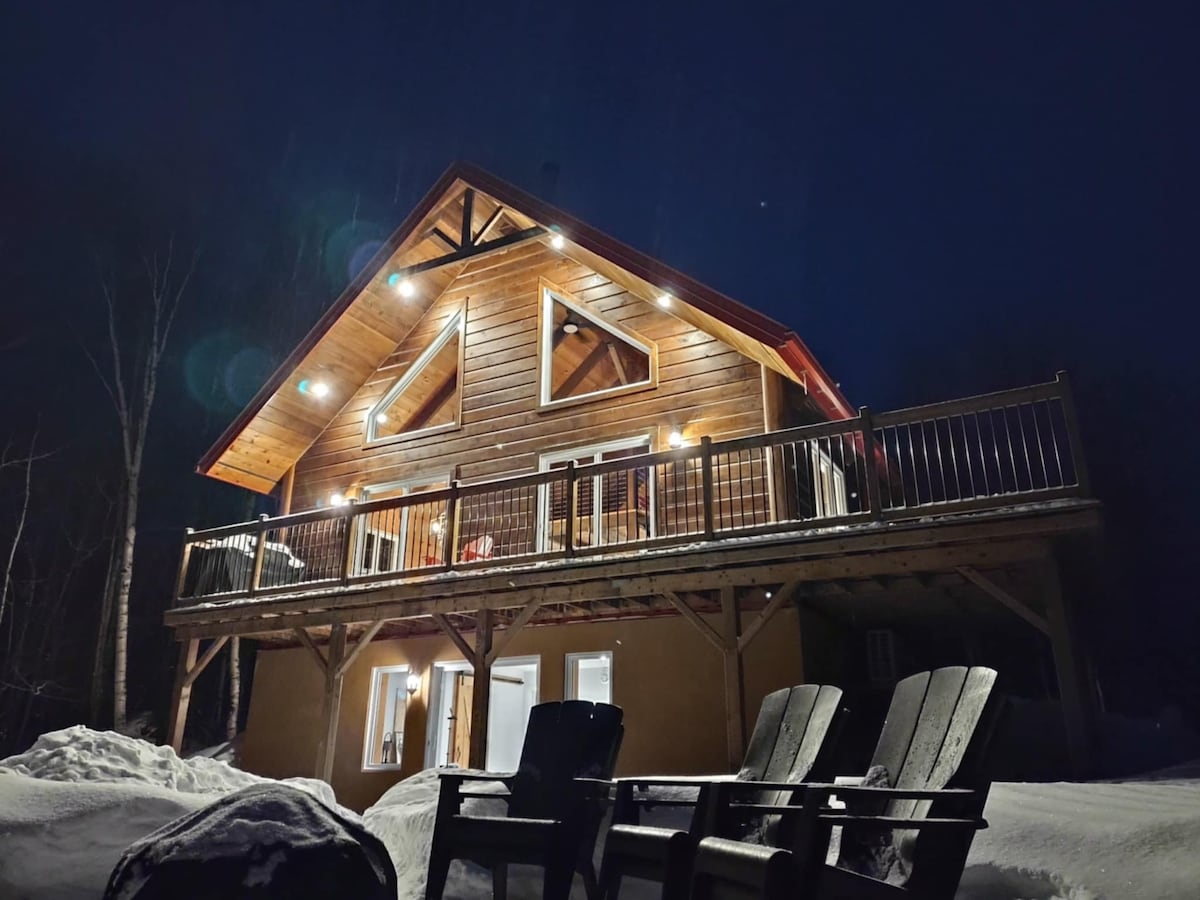 Chalet en pleine nature avec vue sur la montagne. Spa extérieur couvert ouvert à l’année, foyers au bois intérieur et extérieur, planchers chauffants et BBQ. Cuisine complète avec café inclus. Trois chambres : suite des maîtres avec lit king et foyer au gaz, 2e chambre avec lit queen et mezzanine avec lit queen. Terrain de 5 acres avec 2e phase locative prévue en 2026. Parfait pour vous ressourcer. No enr. 309551 exp. 2026-06-08.