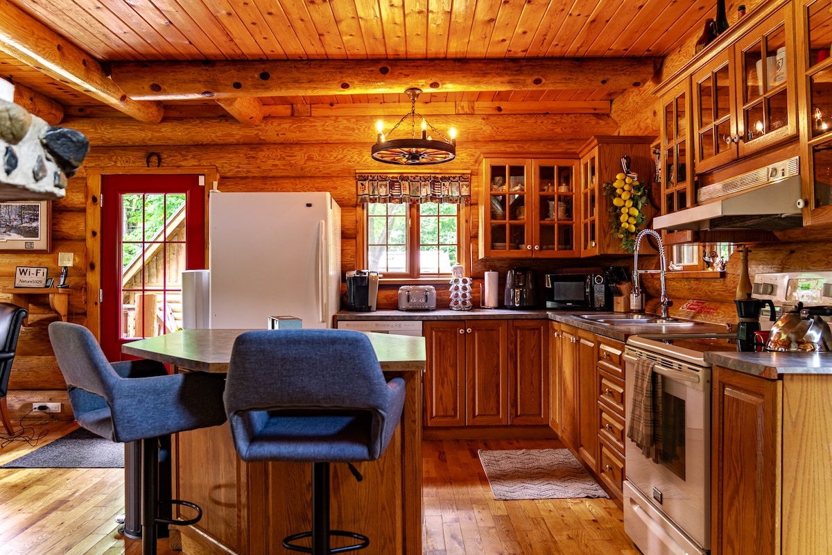 Hermosa casa de madera de tronco con un techo de la catedral y una estufa de leña, situada justo a orillas del lago Desmarais en Estrie. El muelle es el lugar ideal para relajarse. El lago privado es un área protegida (no se permiten motores de gas) y está repleto de truchas y otras especies de peces cada año. Una tabla de surf de remo, canoa y kayak estarán a tu disposición. La bañera de hidromasaje está disponible para su uso todo el año. A partir de enero de 2021 : 1 reservación = 1 árbol replantado a través de Tree Canada