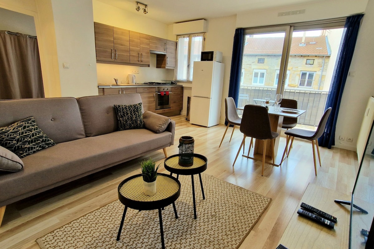 Situé en face de la gare, je me lance dans l aventure Airbnb avec ce studio refait et aménagé rue Ferdinand. A 2 pas du novotel et de l arrêt de tram, vous pourrez grâce à celui ci être en 10 mn dans le centre de saint Étienne, au ZENITH et CITÉ DU DESIGN ou en 20 mn au STADE. A proximité se trouve de nombreux commerces tel que supermarché, restaurants ou snack. L appartement ne donnant pas sur la rue et étant dans une copropriété de petite taille cela permet d être au calme.