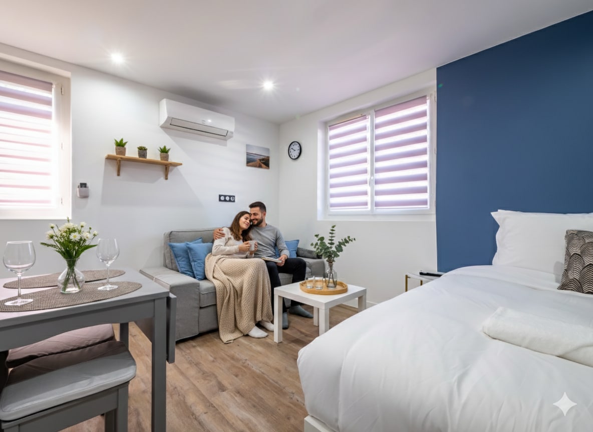 Ce studio chaleureux situé au rez-de-chaussée vous offre un espace bien agencé avec tout le confort nécessaire : un lit double confortable, un coin repas, une cuisine équipée (plaques, micro-ondes, frigo, cafetière), climatisation, TV connectée et wifi. La salle de bain privative dispose d’une douche moderne. Le logement est calme, lumineux et parfait pour un court séjour ou un déplacement professionnel. Stationnement facile et arrivée autonome via serrure connectée. Idéal professionnel.