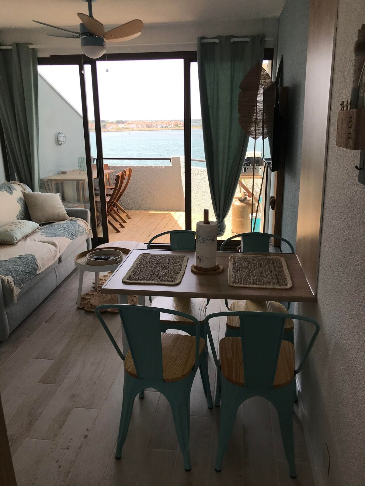 Apartamento en la isla la coudalere en le barcares Con balcón abierto con vistas maravillosas al lago marino y las montañas Cerca del mercado de Navidad Villa de vacaciones con complejo de piscina Complejo deportivo Juegos para niños Animaciones Playa del lago al pie del alojamiento Pesca, actividades náuticas Tiendas comercio restaurante cerca Alojamiento para 4 personas máx. Habitación tipo camarote con literas Sofá cama de verdad poltron e sofa Bañera de hidromasaje Balcón con barbacoa plancha