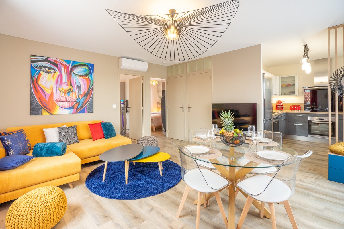 Détendez-vous dans ce logement de "standing"(60m²) calme, confortable, élégant et climatisé pouvant accueillir 4 personnes. Cet appartement propose des équipements haute gamme, 2 chambres, literie de 160 et TV connectées. Doté d'une décoration soignée. Terrasse ensoleillée (20m²). " Parking Privé " Situé dans un quartier résidentiel à 10 min du centre ville de La Rochelle, de l'aéroport, de l'île de Ré et à 150m d'un carrefour-city, boulangerie, transport en commun, cabinet médical et pharmacie.