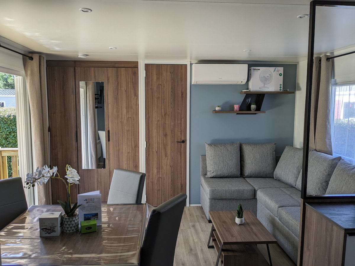 Venez profiter de ce mobil-home de standing, seul(e), en famille, en amis(es) ou avec votre animal de compagnie. Le mobil-home climatisé dispose de 3 chambres et d'une cuisine entièrement équipée ( lave-vaisselle,micro-ondes, four,Airfryer, Senseo, ustensiles de cuisine...) La chambre parentale dispose d'un dressing avec un lave linge. 1 chambre avec 1 lit superposé 1 chambre avec 1 lit simple et 1 lit gigogne La terrasse de 18 m²couverte est composée d'une table avec 8 chaises et d'un salon.