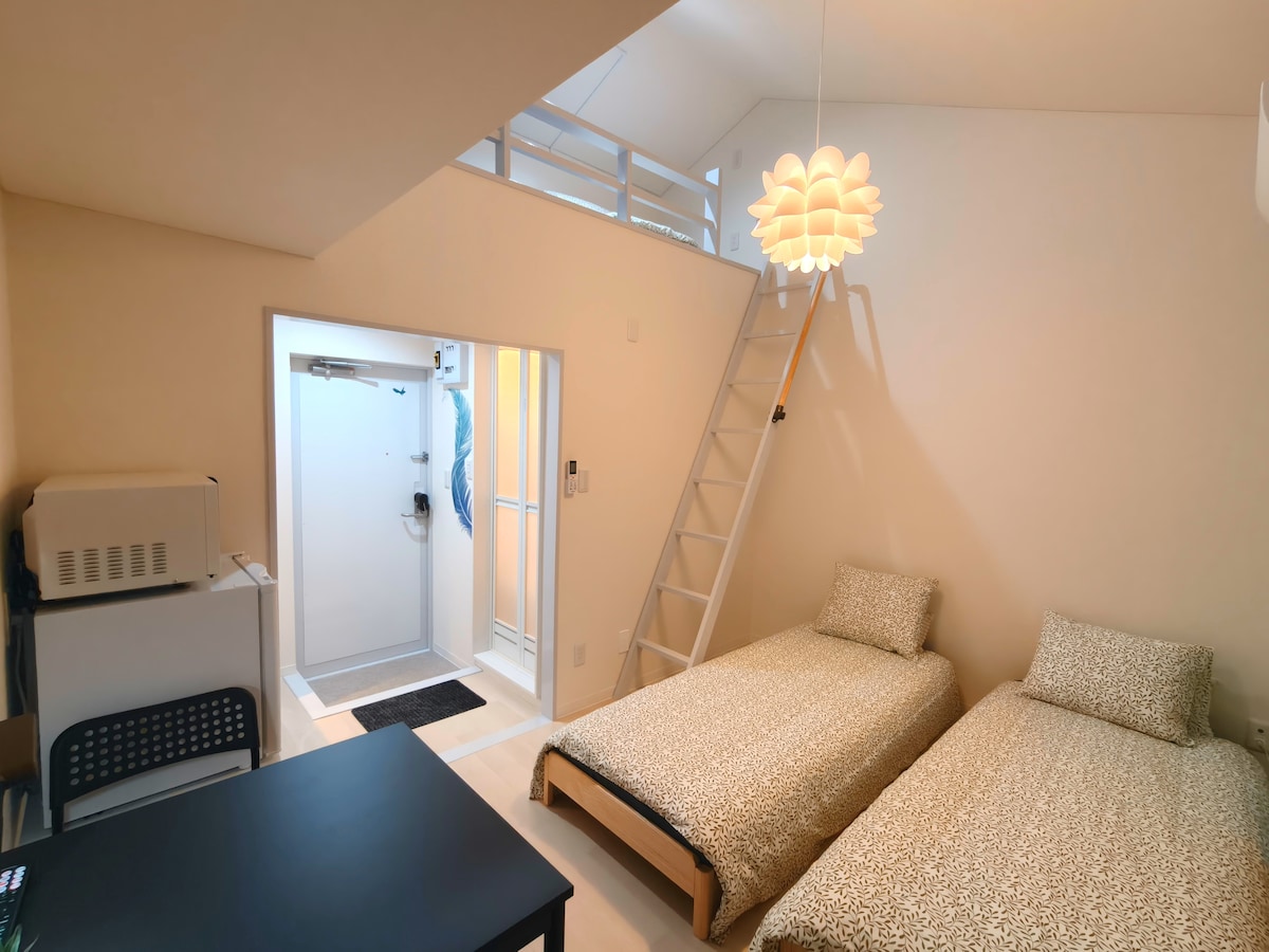 ・Habitación superior en el segundo piso. Baño ・privado (inodoro y ducha) y mini cocina, sala de estar, cama loft. ・Refrigerador, cocina IH, microondas, utensilios de cocina básicos y vajilla. ・2 futones individuales, 2 toallas de baño y 2 toallas de mano. ・2 bicicletas de alquiler gratuito (es servicio gratuito, por lo que no se puede alquilar). ・Secador de pelo, jabón y champú. ・Wifi gratis ・Lavadora y secadora(*tarifa). ・Asaka - Ikebukuro durante 20 minutos/ Shinjuku durante 30 minutos. *2 personas pueden alojarse en el mismo precio. * No se permiten niños menores de 12 años.
