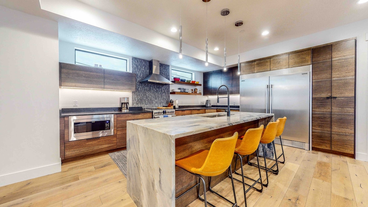 Bungalow de ladrillo de un dormitorio bellamente decorado. Disfruta de la sensación lujosa pero encantadora de la cocina gourmet personalizada con una gran isla, encimeras de cuarzo, combinación de armarios frontales sólidos y de vidrio, electrodomésticos inteligentes de acero inoxidable de primera línea, pregunta a Alexa direcciones, el clima o reproduce música y la pantalla wifi del refrigerador inteligente LG responderá. Baño de azulejos con ducha de vidrio europea, azulejos tipo metro, cabezal de ducha tipo lluvia con presión de agua óptima. Este alojamiento único tiene personalidad propia.