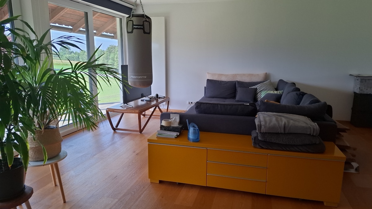 Genieße die schöne Umgebung dieses romantischen Fleckchens in der Natur an der Stadtgrenze Salzburgs. 2023 erbaute 75qm große Loftwohnung am Bio Bauernhof "Edtgut"! Gemütlich und modern, ganz neu erbaut! Eine eigene sonnige Dachterasse mit 2 Liegen und einem Esstisch für 4 P.! Bad mit Dusche, freistehender Badewanne, großer Kücheninsel voll ausgestattet, 2,40m Kingsize Bett und ein ausziehbares 1,80m Schlafsofa befinden sich im offenen Wohnraum! Das WC und ein Abstellraum sind eigene Räume!