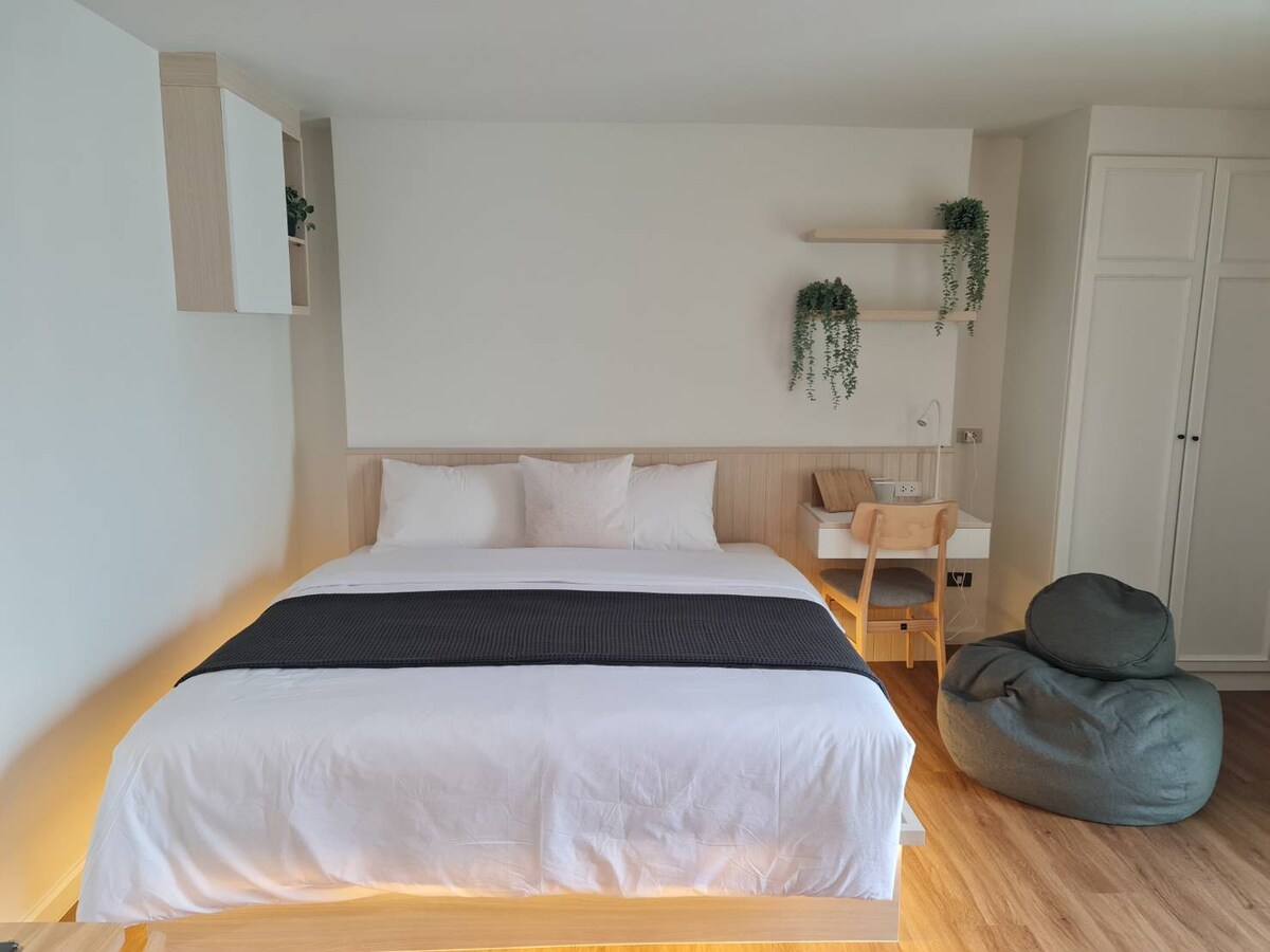 Relax and recharge in our stylish, fully serviced studio apartment located in the vibrant heart of Bangkok. Just a short 10-minute stroll to Ekamai BTS station, we offer the perfect blend of city convenience and tranquil comfort. ✨ Key Features: Spacious private balcony Modern, fully furnished studio with a comfortable king-sized bed Free Wi-Fi, smart TV, and work-friendly desk setup Onsite gym, pool and free parking Housekeeping service for longer stays