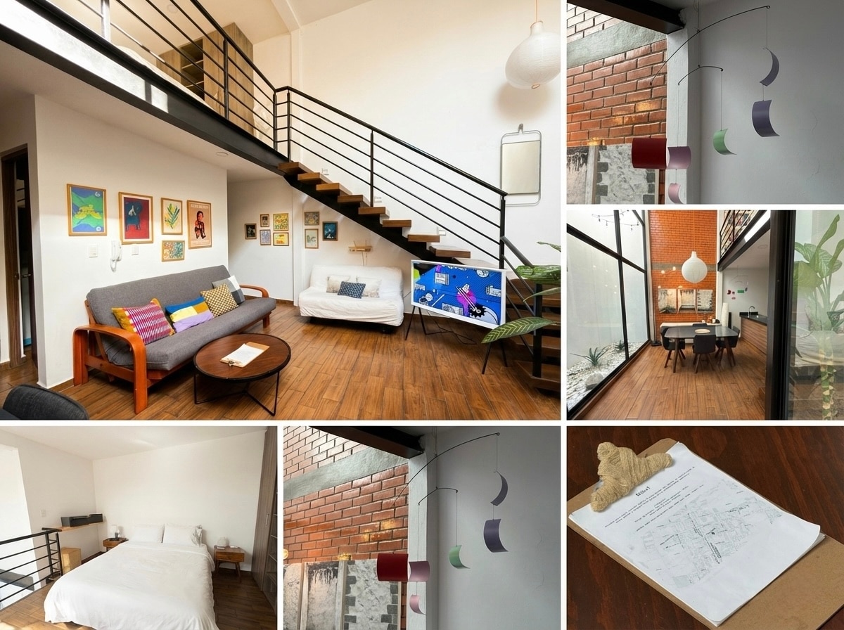 Loft industrial de diseño a unos pasos de la Pirámide, en la mejor calle de San Andrés. Rodeado de los mejores cafés restaurantes, bares. *El espacio: Techos doble altura. Planta baja con sofá cama, Smart TV 55" "The Frame", cocina equipada y medio baño. Mezzanine con cama matrimonial, baño completo y escritorio. Ideal: Parejas, grupos de hasta 4 o Home Office (WiFi 100 Mbps). Nota: Sin cochera privada (hay pensión a 1 cuadra por $50MXN o lugar en la calle).