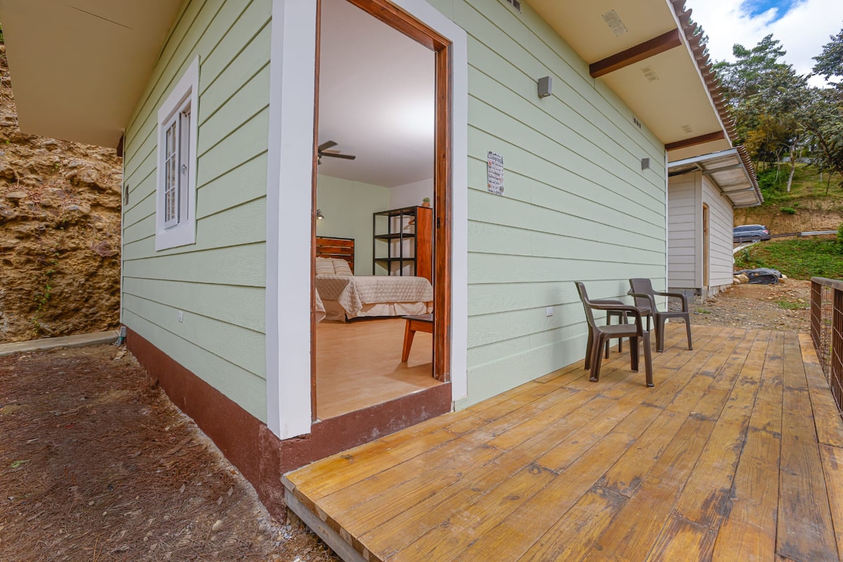 Esta preciosa cabaña está a 5 minutos antes de llegar al Valle de Antón, tiene un solo espacio donde están las camas, cocina y desayunador. Afuera hay una terracita. tiene TV , cafetera y estufa eléctrica sin horno. Los últimos 3 minutos del camino es calle de piedra, pero un Picanto pasa sin problemas. Se permiten hasta 2 perros pequeños. Check in 3 pm y Check out 12 md.