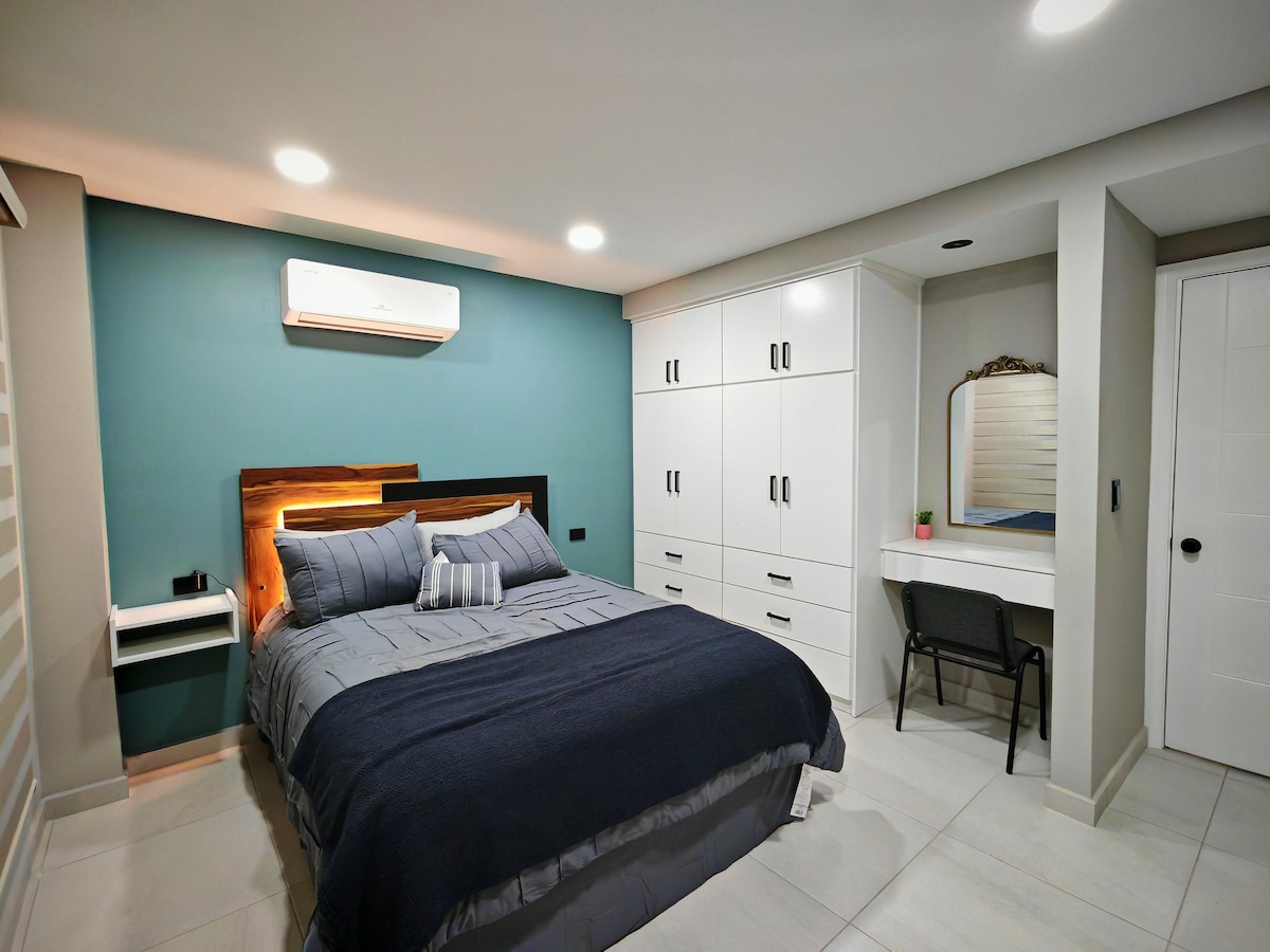 Estamos a 5 minutos del aeropuerto 10 min de consulado 15 min de CAS 12 min de garitas internacionales 5 minutos de centro de alto rendimiento 12 min Medical plaza Traslado a bajo costo al AIRBNB, Consulado, CAS y Garitas (preg flexibilidad) Entrada independiente mediante caja de seguridad Habitación en 3er piso, cuenta con: Cama queen y baño propio Espacio en terraza con mesa de patio TV Smart con Netflix, MAX Acceso a transporte público a 10 mts Realizamos factura