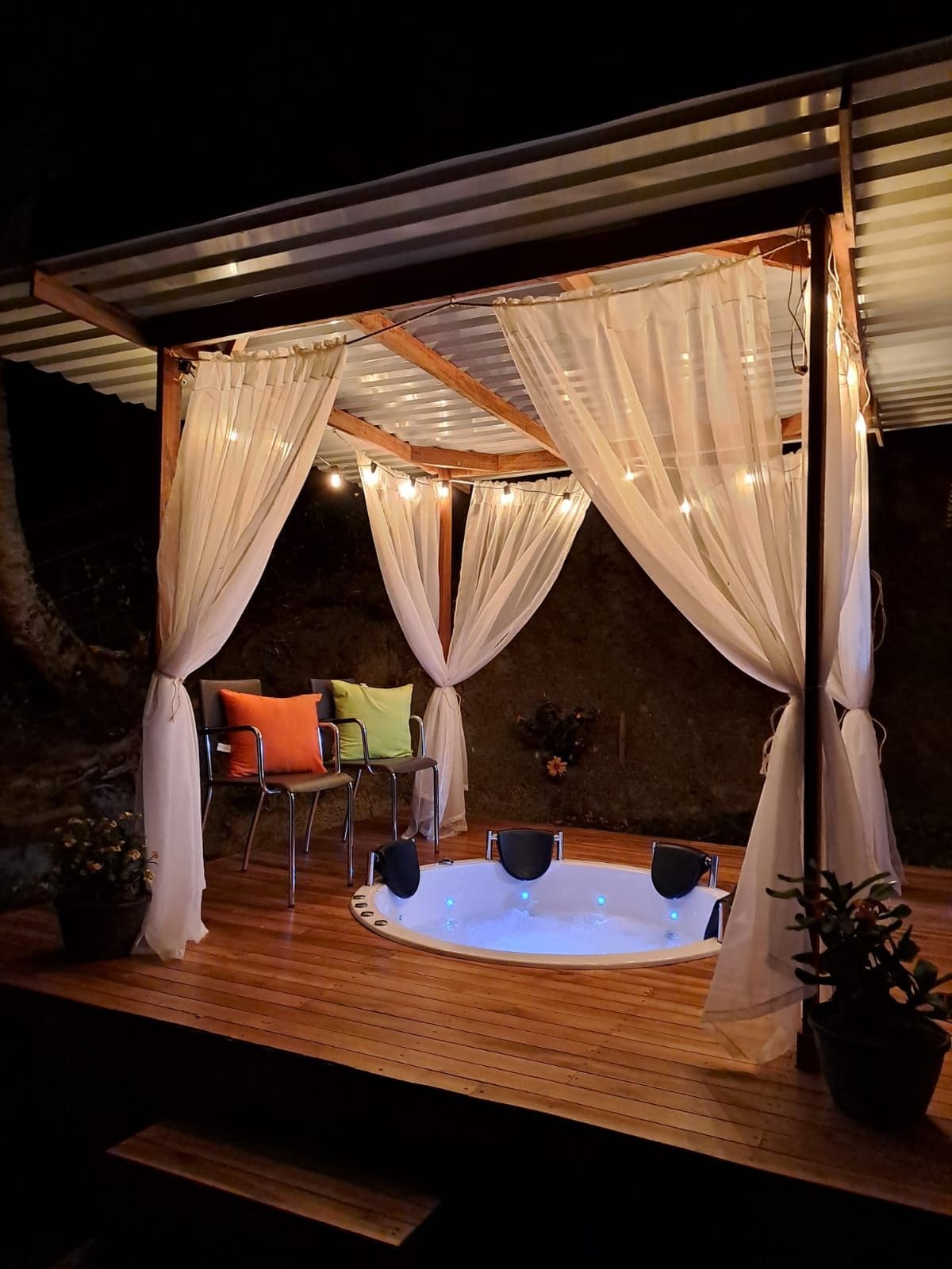 Cabaña Luz de Luna es una cabaña totalmente privada con vista a un hermoso paisaje, está adecuada y dispuesta para que vivas una experiencia única con tu persona favorita. Incluye: - Desayuno para dos personas - Bebida de bienvenida - Jacuzzi privado exterior - Baño privado - Mini cocina - Culumpio - Juegos de mesa - Hamaca en exterior - Fogata - Parqueadero - Vista a hermoso paisaje - Habitación privada con vista al paisaje