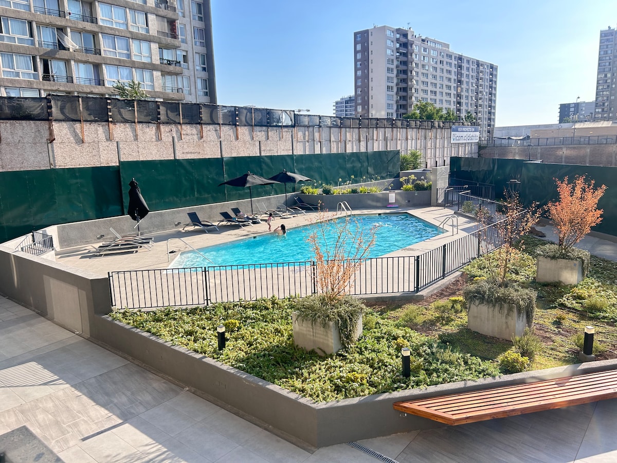 Acogedor y luminoso departamento con balcón, equipado con cama queen y un futón para un tercer huésped. Cocina Full Equipada Wi‑Fi 500 Mbps Smart TV Guarda‑equipaje gratis Pet‑friendly A solo 3 min del Metro Departamental, supermercados, restaurantes y cafés a pasos. Autopista Central a solo 5 min. Disfruta de gimnasio, quinchos y lavandería autoservicio en un edificio residencial seguro con conserjería 24/7. Ideal para parejas y estadías largas. ¡Reserva y vive Santiago como en casa!