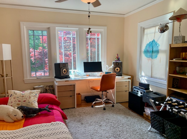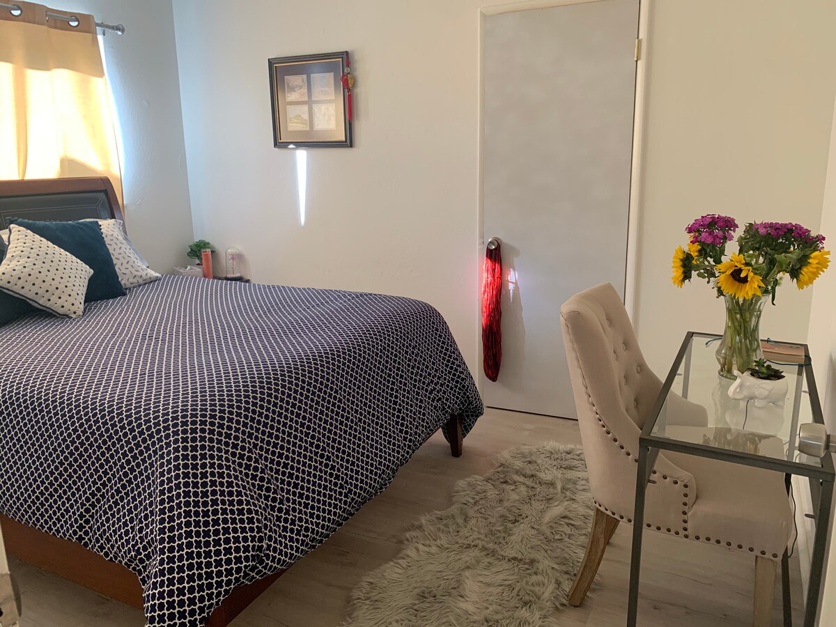 ¡Estamos encantados de recibirte en nuestra tranquila y espaciosa suite de invitados tipo estudio! Nuestra suite con entrada independiente está en la planta baja de nuestra casa moderna de mediados de siglo de dos plantas. El dormitorio es amplio e incluye una cómoda cama tamaño queen con la parte superior acolchada. El baño de lujo tiene una gran ducha acristalada con cabezal de ducha de efecto lluvia, dos tocadores y un vestidor. Dentro del vestidor, también hemos preparado una estación de café y té con una mininevera y un dispensador de agua fría/caliente.
