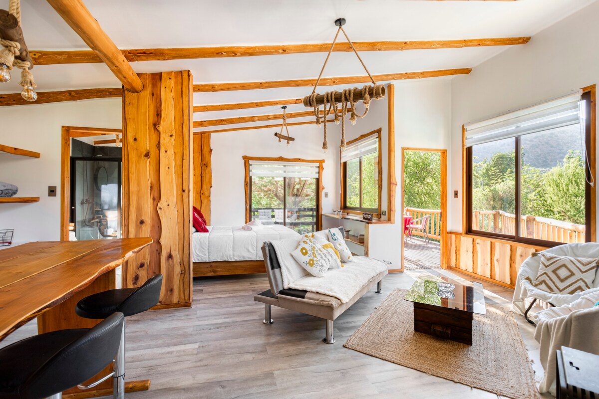 Disfruta de una acogedora cabaña de estilo rústico, rodeada de montañas y naturaleza, perfecta para parejas que buscan desconectarse y descansar. A solo 3 minutos de la calle principal, con acceso directo y portón eléctrico, tendrás privacidad y comodidad en un entorno seguro. Relájense en la tinaja al aire libre y/o explorando rutas de trekking, atractivos turísticos y restaurantes locales. Un espacio pensado para vivir la montaña con tranquilidad, romanticismo y comodidad.