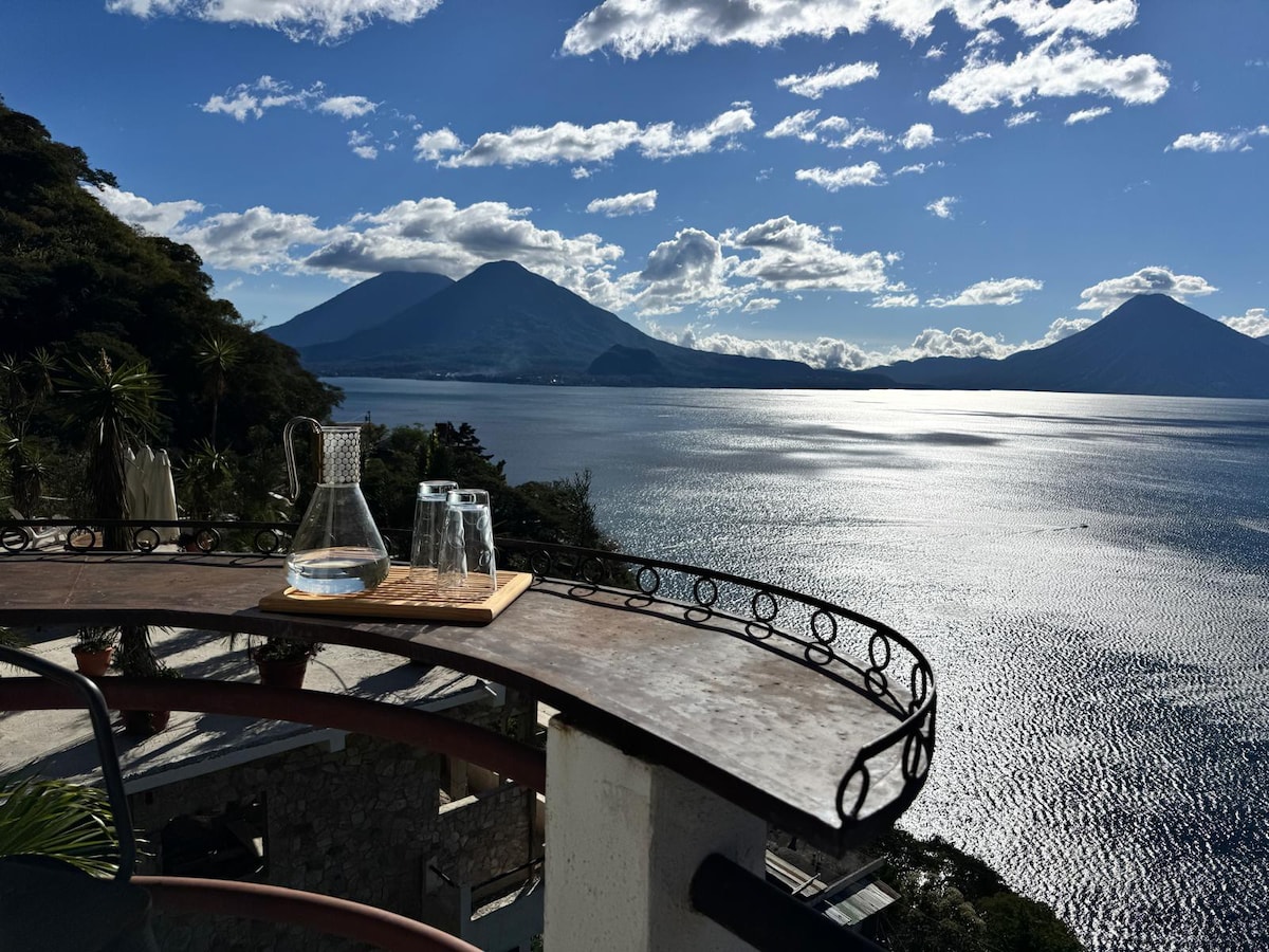 Moderna se encuentra con Maya, esta casa frente al lago, a 10 minutos en barco de Panajachel, es un lugar único. Dos dormitorios con puertas correderas a balcones con vistas al lago y a las montañas circundantes. Tipo loft en la planta baja con salón/comedor y cocina para compartir tiempo de calidad juntos mientras contemplas el lago. A poca distancia a pie de restaurantes para cenas con velas, kayak/subalquiler y caminatas a lo largo de senderos de montaña o la orilla del lago. Privado pero seguro y accesible. ¡Prepárate para una estadía encantadora!