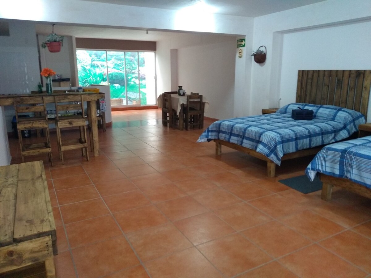 La habitación es muy amplia, cuenta con dos camas matrimoniales, una mesa con sillas, closet, cocina, televisión, WIFI, y baño completo. En el área de acceso se cuenta con espacio para estacionamiento y area con escritorios para trabajar. El lugar se ubica muy cerca de la Fenapo, del Centro de Convenciones, del Parque Tangamanga, y de las Universidades Cuauhtémoc, Cruz Roja, San Pablo y Politécnica