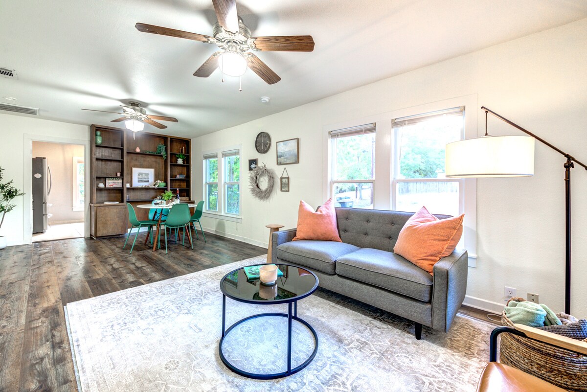 ¡Disfruta de una estancia de lujo en nuestra moderna casa! ¡Duerme bien con ropa de cama de alta gama y disfruta de los servicios que te ofrecemos pensando en divertirte! Las salas de estar interiores/exteriores son perfectas para que grupos y familias pasen un buen rato en la casa. O bien, echa un vistazo a lo que San Marcos tiene para ofrecer: estamos ubicados en el centro, a solo 1 milla de la plaza (donde puedes encontrar muchos bares, restaurantes y actividades), a poca distancia a pie del campus de la Universidad o a poca distancia en coche del río y los centros comerciales.