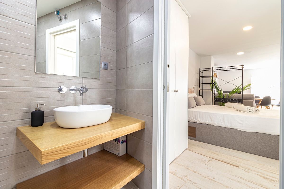 Bonito estudio reformado en pleno Paseo Marítimo de Cádiz con Wifi y con aire acondicionado y perfectamente equipado (nespresso,microondas,sartenes,ollas,platos,vasos,tazas...) Cama de 135cm para 2 personas con colchón de viscolástica. Dispone de sábanas,toallas de baño y toallas de playa. Edificio con ascensor. Acceso directo a la playa. Muy limpio. Inscrito en el Registro de Turismo RTA: VFT/CA/00183