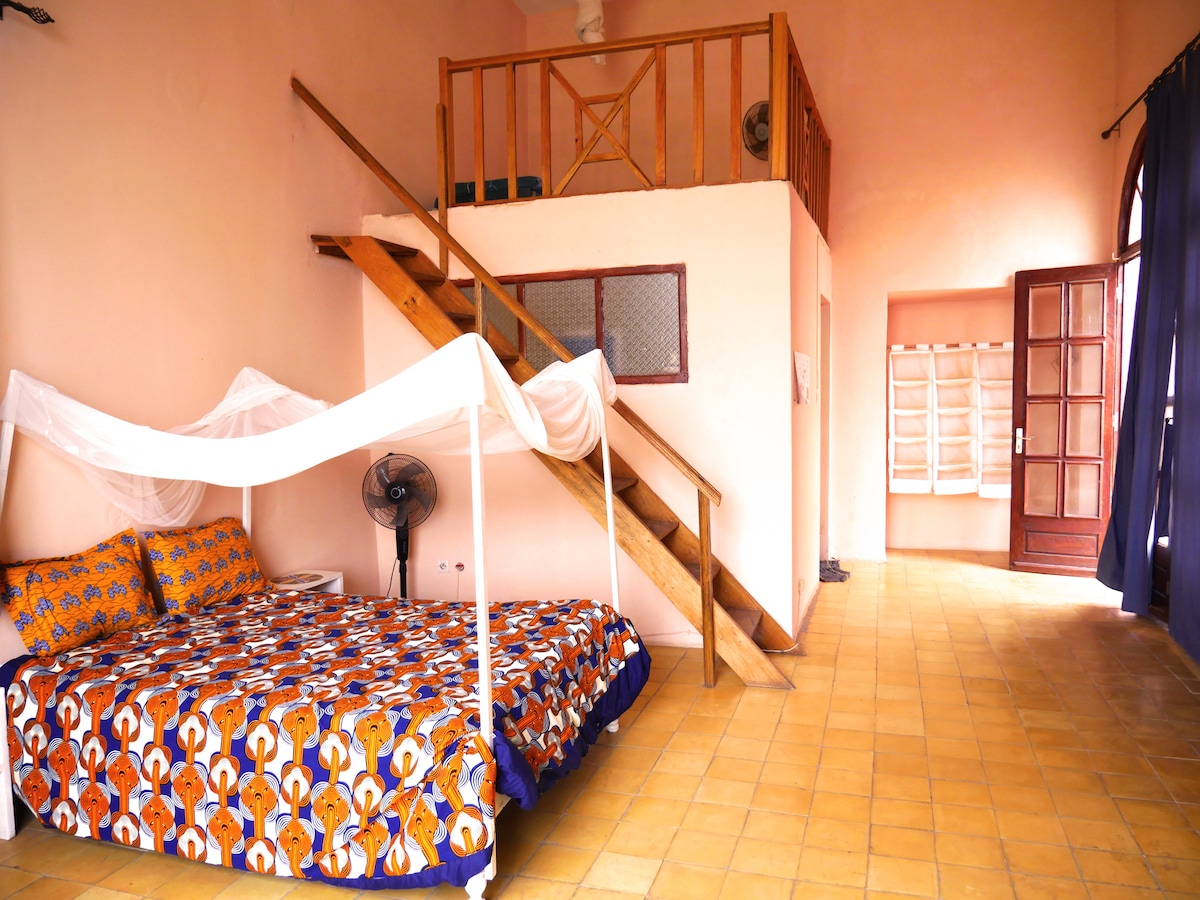 El alojamiento de una sala de estar y un dormitorio, con una cocina totalmente equipada abierta a la sala de estar, se encuentra en el corazón de la isla norte de Saint-Louis, en el primer piso de una casa recientemente rehabilitada. Su diseño y ubicación ofrecen un alojamiento cómodo y agradable. La azotea accesible permite descubrir un panorama único de la ciudad de Saint-Louis y el río Senegal. Bienvenido a la casa «Galle métisse».