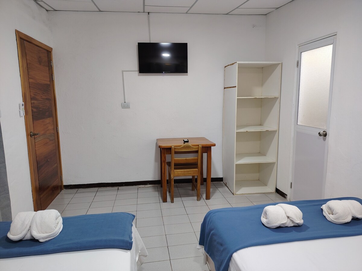 Habitación en segunda planta. La habitación cuenta con 2 camas Queen, aire acondicionado, baño privado con agua caliente y secador de cabello. Disfruta de nuestra piscina luego de tus actividades turísticas. Te brindamos agua filtrada, te y café Galapagueño free 24 horas, disponible cundo lo necesites. Nuestras tarifas no incluyen 15% IVA, por favor si eres de ECUADOR y requieres Factura comunícate con nosotros antes de confirmar tu reserva.