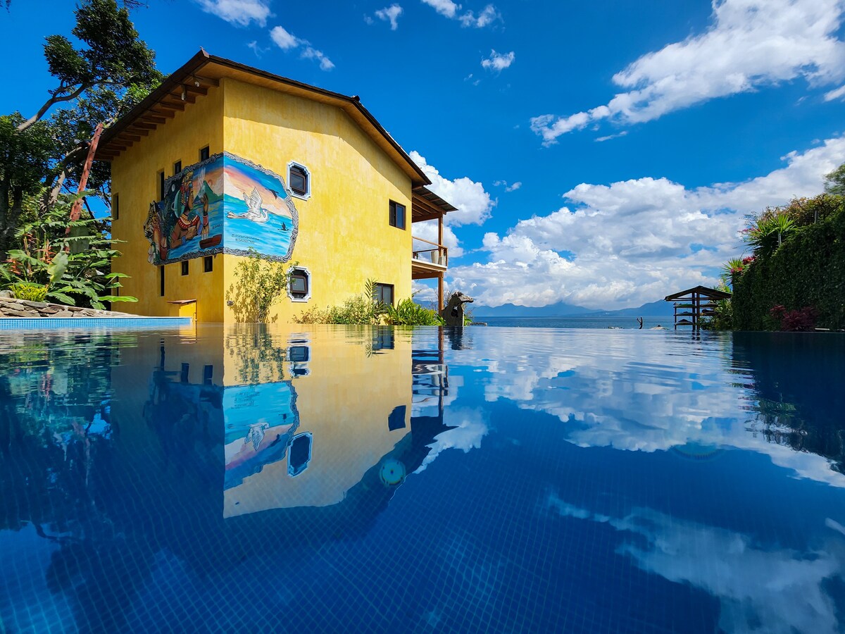Moderna se encuentra con Maya, esta casa frente al lago, a 10 minutos en barco de Panajachel, es un lugar único. Dos dormitorios con puertas correderas a balcones con vistas al lago y a las montañas circundantes. Tipo loft en la planta baja con salón/comedor y cocina para compartir tiempo de calidad juntos mientras contemplas el lago. A poca distancia a pie de restaurantes para cenas con velas, kayak/subalquiler y caminatas a lo largo de senderos de montaña o la orilla del lago. Privado pero seguro y accesible. ¡Prepárate para una estadía encantadora!
