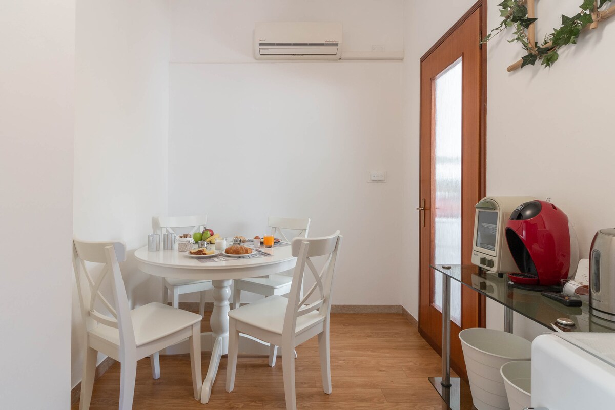 Bonito apartamento con aire acondicionado, lavadora y espacio exterior. A 100 metros de una parada de autobús y una tienda que vende frutas y verduras frescas y comestibles todos los días. Si te interesa la comida y los vinos locales, podemos darte algunos consejos sobre tiendas y granjas cercanas. Supermercado más grande abierto 7/7 a menos de 10 minutos (a pie). El castillo de la ciudad (en Prosecco Hills) está a 20 minutos a pie. Vivimos cerca, hablamos italiano, pero nuestros hijos nos ayudan a dar la bienvenida a huéspedes extranjeros.