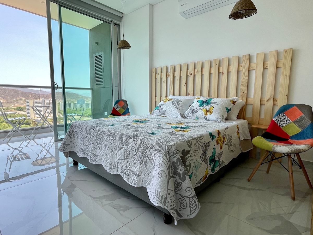 Espectacular apartamento moderno para estrenar en un piso 17 con vista al mar y salida directa a la playa. Espacio agradable para tomar vacaciones, descansar y/o trabajar home office. A 10 minutos del aeropuerto internacional y del centro histórico de Santa Marta, cerca a zona de restaurantes, bares, centros comerciales y farmacias. A menos de una hora del Parque Nacional Tayrona, Taganga, Minca. El apartamento cuenta con un amplio balcón donde podrás disfrutar del mejor atardecer de Colombia.