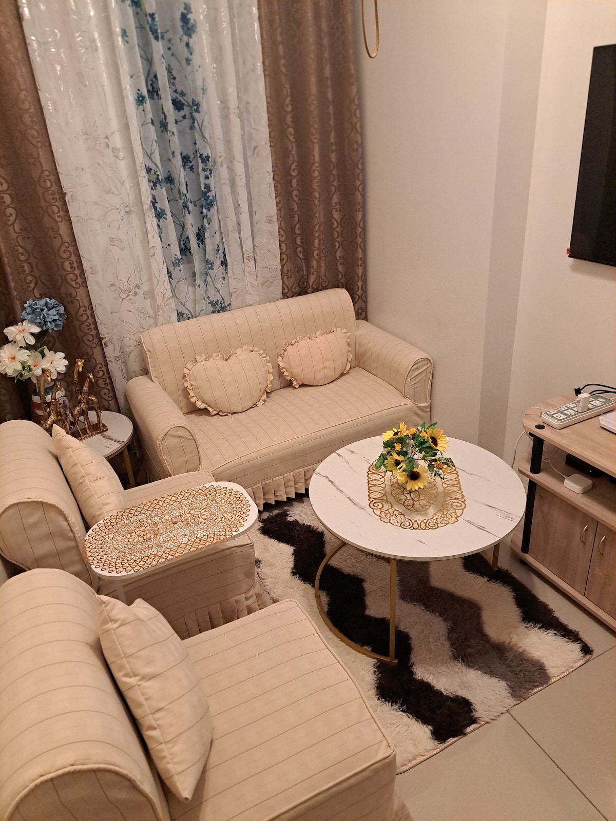 Welcome to Shia Staycation! A serene and stylish retreat within Trees Residences. Minimalist Design: Clean, simple, and elegant space. Entertainment Hub: 55" Smart TV with Netflix, Karaoke and a PS4. Ambiance Lighting: Multi-color lights for any mood. Comfortable Bed: Hotel-grade Double-sized bed for restful sleep. Modern Amenities: High-speed WiFi, fully equipped kitchen, study/computer table. Bathroom Comforts: Water heater with a table top. Ample Storage: Spacious cabinet for organization.
