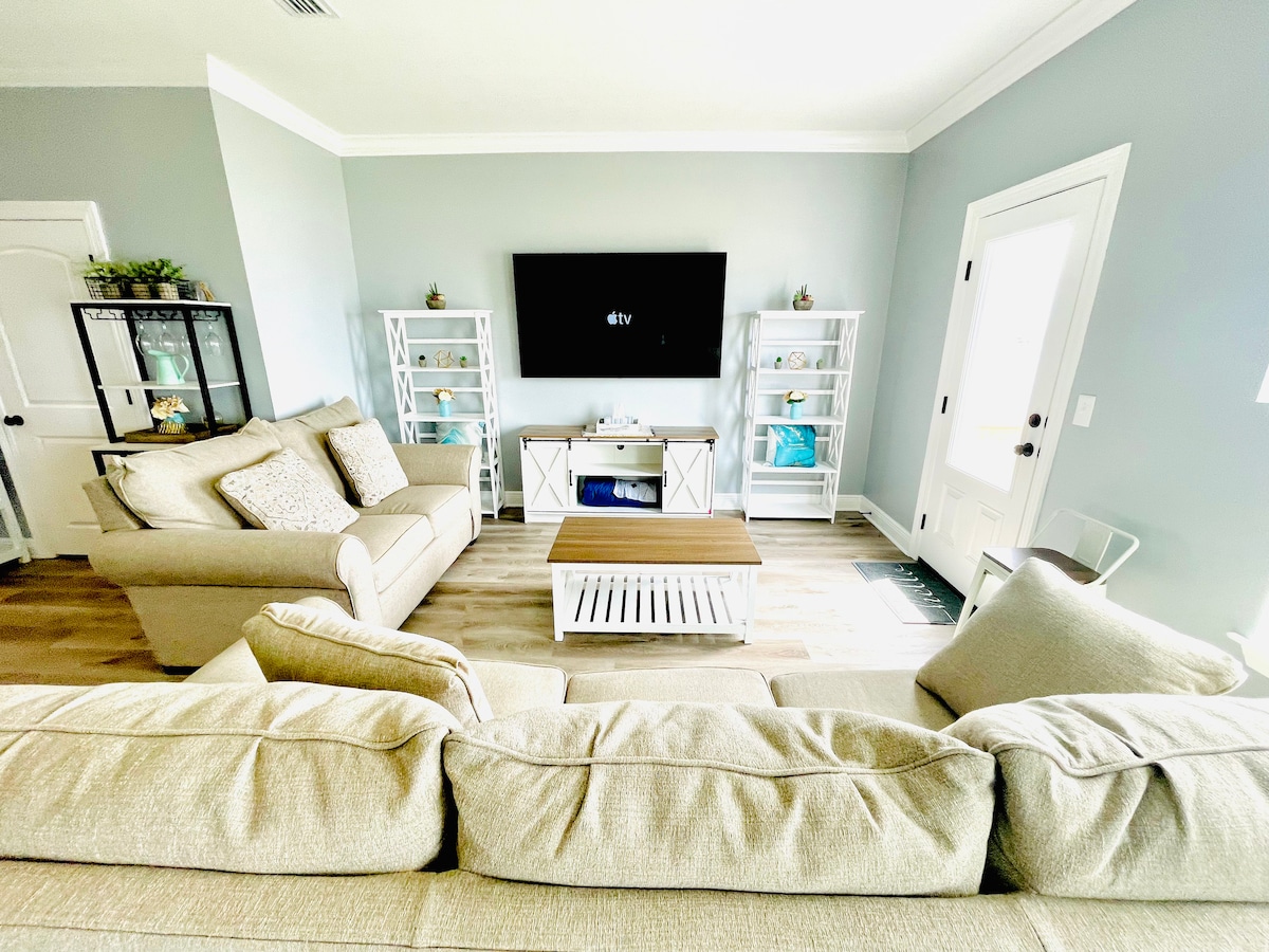 ¡Bienvenido a tu escapada a la playa! Hermosa casa a poca distancia a pie (1,5 millas, 1,2 millas caminando sobre la calzada con senderos protegidos a cada lado) de la arena blanca y azucarada de Navarre Beach, las olas del sonido de Navarra, muchos restaurantes y mucho más. ¡Servicios a montones! Dos terrazas cubiertas para relajarse, chimenea para relajarse por la noche y un porche cerrado con iluminación exterior. Disfruta de un paseo en bicicleta a la playa o de una siesta en la hamaca del patio trasero al final del día. Habitación para 6 personas.