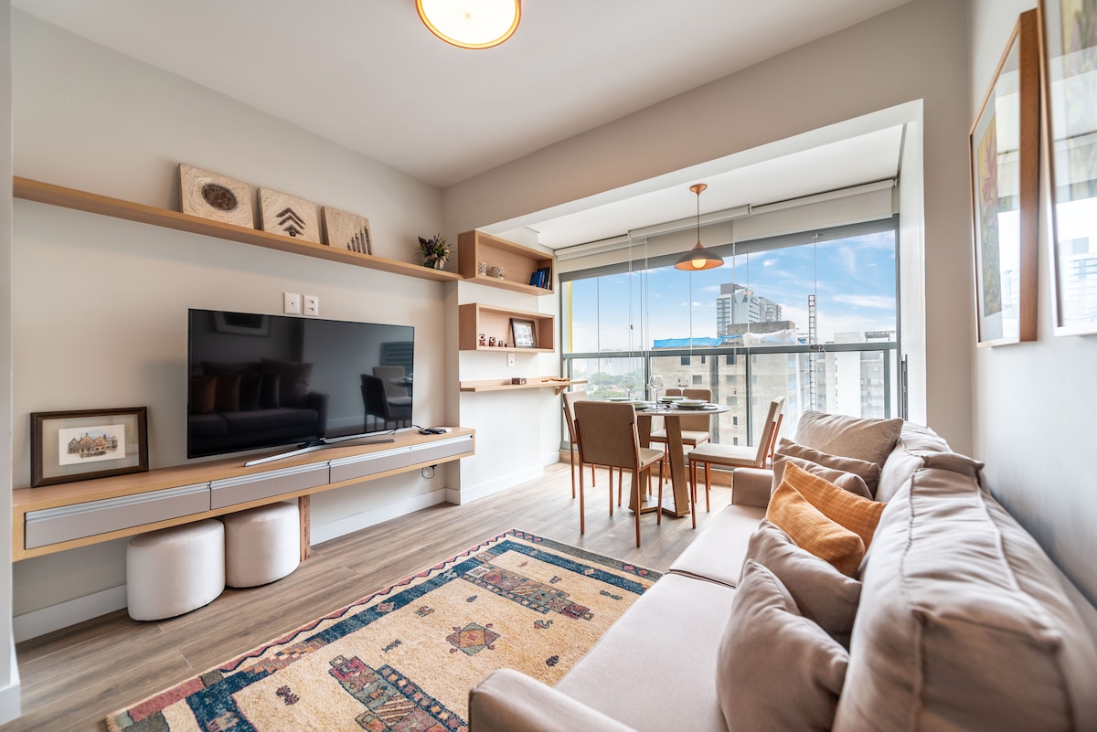 Estudio recién reformado, con estilo propio, urbano y cosmopolita. De alto estándar, hermoso, creativo y bien ubicado, con una vista privilegiada desde el piso 21 al Allianz Parque. Junto a varias tiendas, medios de transporte, parques, puntos turísticos y edificios de negocios. El estudio está completo, con una cómoda cama doble, cocina con todos los utensilios, minibar con congelador e internet de alta velocidad. Perfecto para personas que valoran las experiencias memorables y únicas.