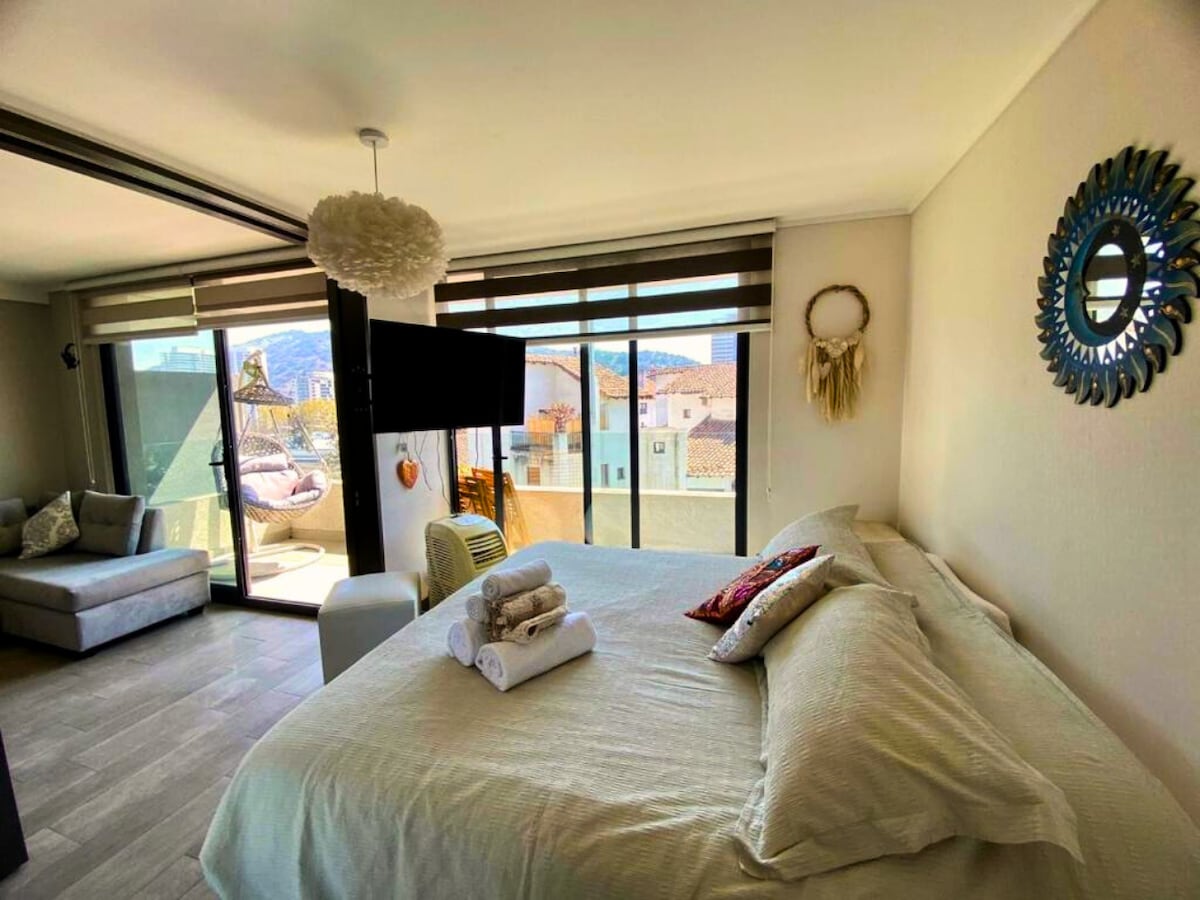 ¿Buscas estilo, descanso y buena ubicación? Este cálido y luminoso estudio tiene todo para una estadía inolvidable en Santiago. Está full equipado para 2 personas: ♨️ Aire acondicionado 🍴 Cocina full equipada 💻 Excelente Wifi y Zona de trabajo ✨ Decoración boutique 🥩 Parrilla a gas 🏓 Mesa de ping pong 🗻 Vista a la Cordillera 📚 Libros y juegos de mesa ¡Tenemos una guía local con recomendaciones para que disfruten al máximo de esta increíble ciudad!