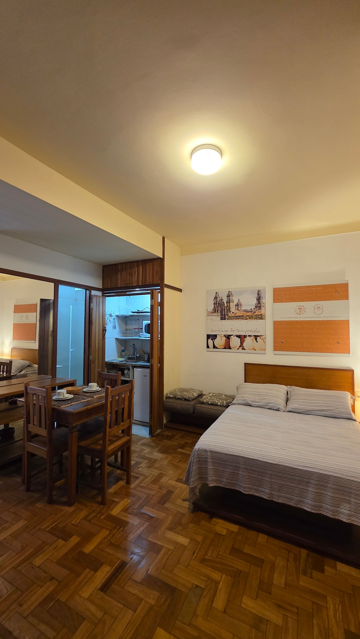 Estúdio composto por quarto com duas camas de solteiro (ou uma de casal), mesa de trabalho, armário embutido, cômoda, TV e Wi-fi; cozinha com mesa, duas cadeiras, frigobar, pia, armário, fogareiro elétrico de uma boca, omeleteira e acessórios; banheiro espaçoso e varanda. O espaço é independente da casa e totalmente privativo. Acesso através de escada.. Localizado na Rua Frei Estevão, 122 - Bairro Bomfim - SJDRei- MG - próximo da Igreja de SãoFrancisco.