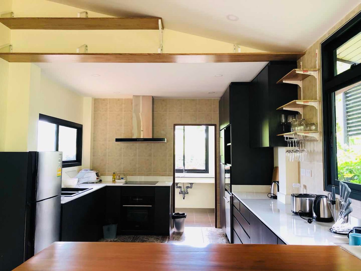 La casa ajardinada más grande del pueblo, 4 dormitorios, 4 baños, 273 pies cuadrados, adecuada para familias numerosas o de 4 a 8 huéspedes o más. La casa está decorada con muebles en cada habitación. Puedes organizar fiestas y fiestas. Hay una cocina europea, una cocina tailandesa y una lavadora, así como una lavadora. La casa tiene seguridad. Hay una puerta remota. Estacionamiento para 5 autos. Hay un guardia de seguridad las 24 horas del día. Seguro y protegido. Hay todos los residentes vecinos no muy lejos de la caseta de vigilancia (si quieres alquilar un auto, hay un cargo adicional, se puede notificar).