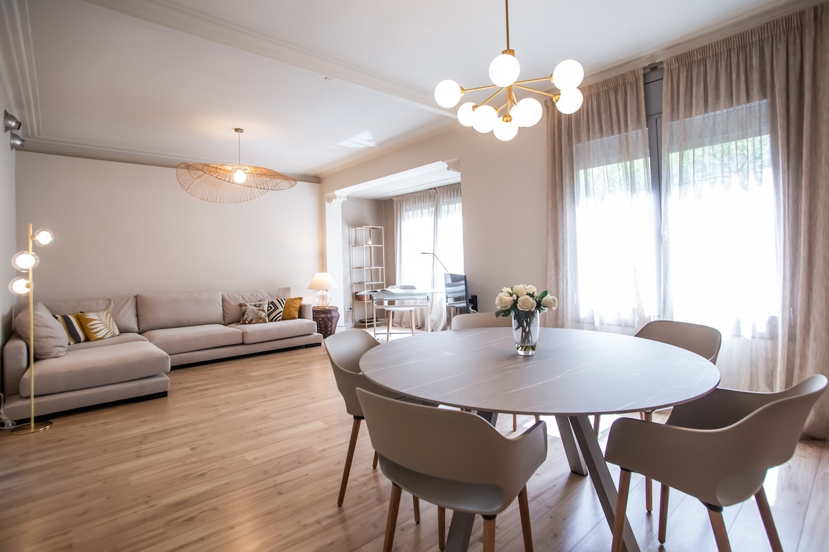 Te doy la bienvenida a tu elegante y familiar refugio de 125 m². Diseñado para una comodidad suprema, este departamento contemporáneo realmente se siente como un hogar lejos de casa. Las ventanas del piso al techo inundan el espacio de luz y te conectan con un patio exuberante y bellamente arreglado. Ubicado cerca de la estación de tren principal de Sants (Sants Estació), nuestra posición estratégica garantiza una conectividad excepcional con conexiones directas y fáciles con el aeropuerto y el centro de la ciudad. Disfrutá de viajar sin complicaciones y de una estadía familiar o de negocios inolvidable.