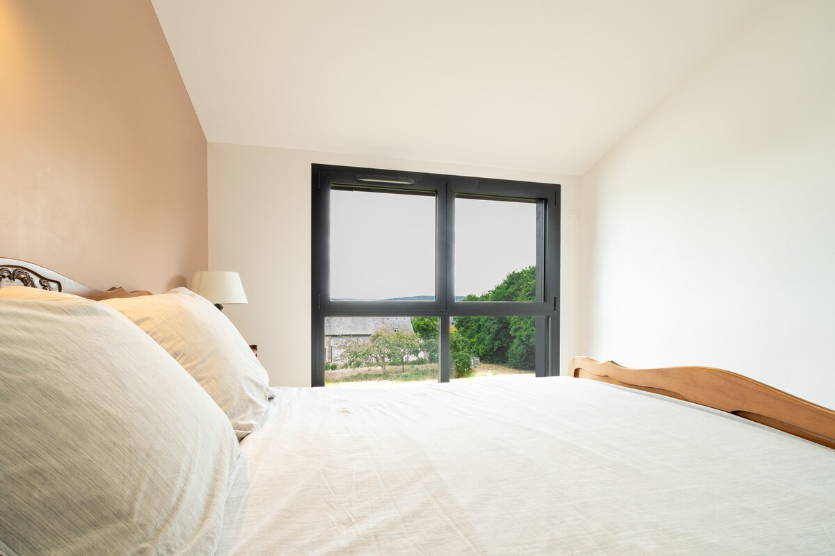 Encantadora casa abierta al exterior que ofrece unas vistas inmejorables de un sitio preservado. Diseñada para familias que buscan comodidad y relajación. La cocina abierta y acogedora es perfecta para compartir momentos en familia. Las habitaciones con sus camas de 160*190 le prometen noches de descanso después de agradables paseos por la zona. Disfrute de la terraza con una sala de estar y una zona de comedor. A solo 20 minutos de Rennes, a 1 hora de la playa, a 5 minutos de las tiendas de alimentos y médicos.
