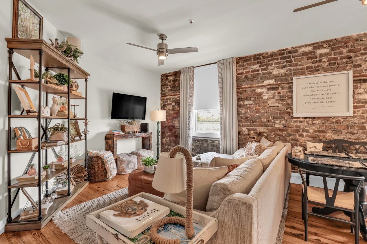 PRIME Congress Street Location • Historic 1860s Loft with Exposed Brick + Beams • Right in the thick of downtown life: step out in the gorgeous city! • 2 King Beds • Sectional sofa with pull-out sleeping option • Beautifully restored hardwood floors • Ultra-high ceilings with exposed beams • Washer & dryer (free to use during your stay) • 65” Smart TV in living room + Roku TVs in bedrooms This is a licensed short-term rental in the City of Savannah, GA. Permit #SVR-03218 License SVR-03218.