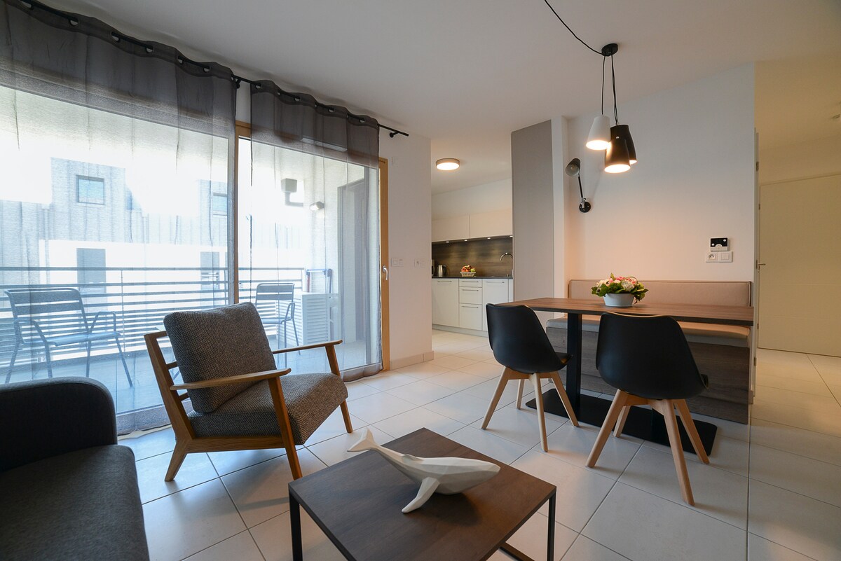 Apartamento de 45 m² con capacidad para 5 personas, que incluye: - Dormitorio con cama de matrimonio de 180 x 200 cm o dos camas individuales de 90 x 200 cm. - 2 literas (90 x 200 cm) ubicadas en el dormitorio principal o en una habitación separada. - Un salón con un sofá convertible para una persona (90 x 200 cm). - Un baño con bañera e inodoro. - Cocina completamente equipada. - Terraza privada - Una plaza de aparcamiento en el aparcamiento protegido del hotel.