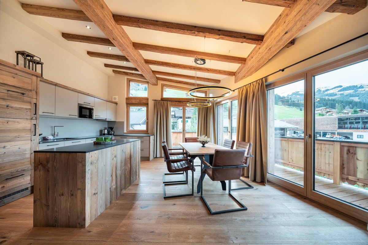 Los chalets de lujo de 200 metros cuadrados están amueblados con gran atención al detalle. Los muebles, hechos con materiales de la más alta calidad, combinan un diseño moderno con un ambiente alpino. Cada chalet se extiende en tres niveles con dos terrazas y un balcón, y tiene capacidad para entre 8 y 10 personas. Desde todos los pisos, podés disfrutar de vistas panorámicas de las montañas tirolesas. Cada uno de los cuatro dormitorios tiene un baño separado. El living y el comedor compartidos con una cocina abierta totalmente equipada