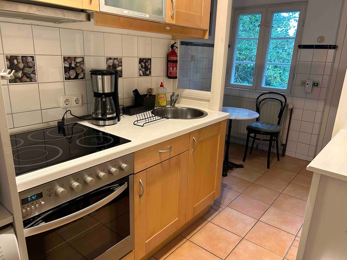 Gemütliche schön helle Dachgeschosswohnung, 2 Einzelbetten 1,00x 2,00 m oder zusammengeschoben als Doppelbett (200x200), sowie ein Einzelbett (100x200) im seperaten Nebenzimmer (auch Ankleidezimmer). Wenn weitere Gäste dazu kommen, besteht die Möglichkeit eine Klappmatratzen für den Fußboden auszuklappen; kleine voll ausgestattete Pantry Küche, tolle Badewanne und Dusche, Fernseher, Telefon und WLAN Eigener Parkplatz ist direkt vor der Haustür vorhanden.