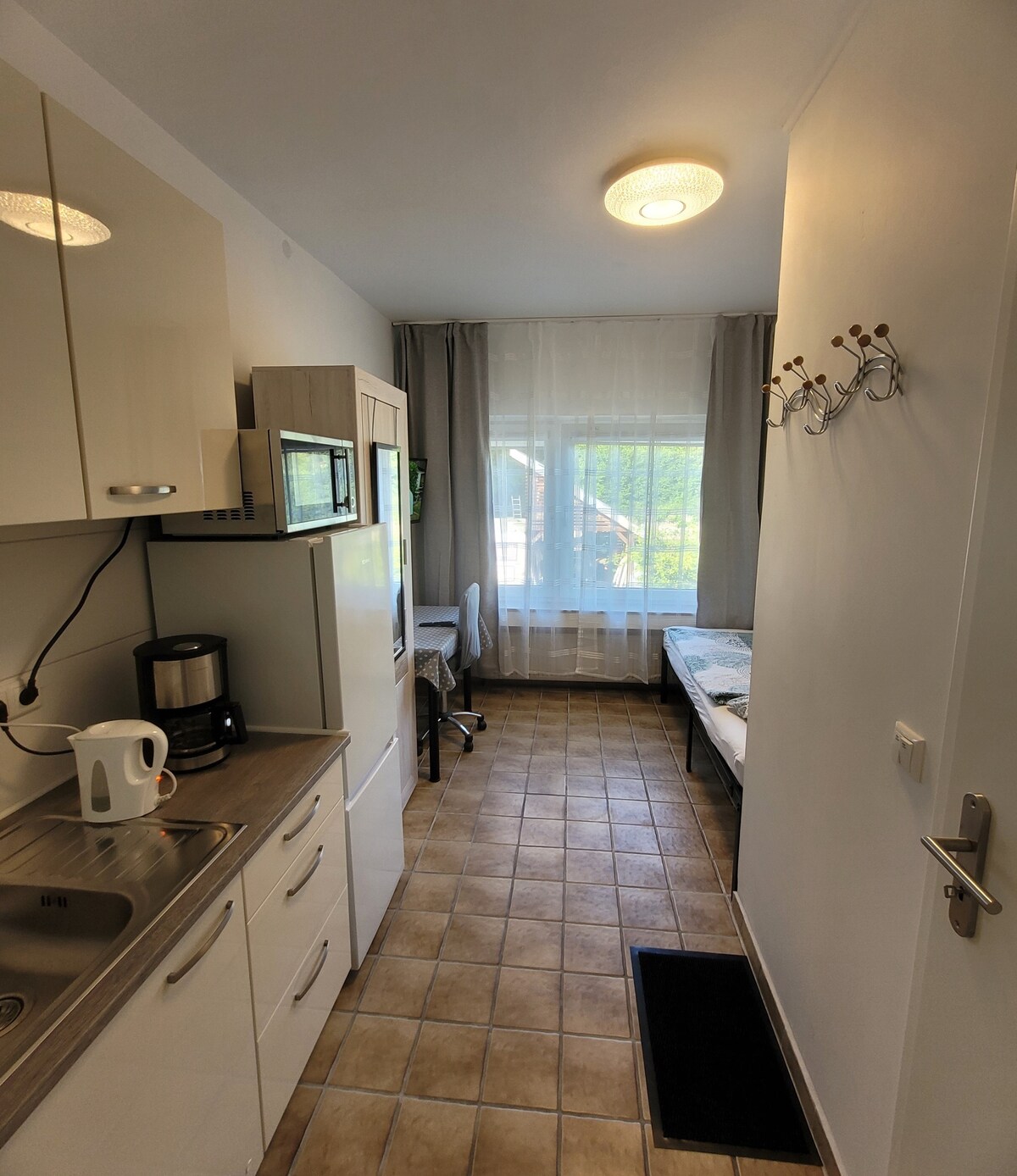 Pequeño apartamento totalmente amueblado en una antigua granja para una o dos personas con entrada independiente y vistas al jardín de la casa. Situado en un barrio residencial tranquilo, estamos a poca distancia en transporte público (a 2 kilómetros de la estación y la universidad). La habitación principal (suelo de madera) está equipada con un pequeño escritorio, silla, acceso WLAN, TV, cama (1,40 x 2,00 m) con fundas, sillón y armario. La minicocina viene con cocina, nevera, microondas, hervidor de agua, mesa pequeña con sillas, etc. Hay un baño de suelo nivelado con ducha y lavadora. Aparcamiento gratuito y seguro junto a la casa. Puedes usar tu propia terraza, sillas y mesa. Por favor, consulta con nosotros primero si quieres reservar a partir de diciembre.
