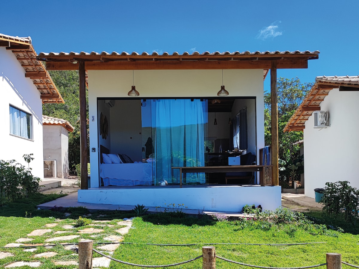 Hospede-se em nosso chalé e descubra a Chapada Diamantina com conforto e segurança. O espaço conta com quarto espaçoso, TV smart, cozinha equipada em conceito aberto, sala com sofá-cama, banheiro amplo e chuveiro quente. Acomoda até 3 adultos. A 10 min do centro (4km), com acesso por estrada de terra em boas condições. Estacionamento privativo com controle eletrônico incluso. Ideal para quem busca conexão com a natureza.