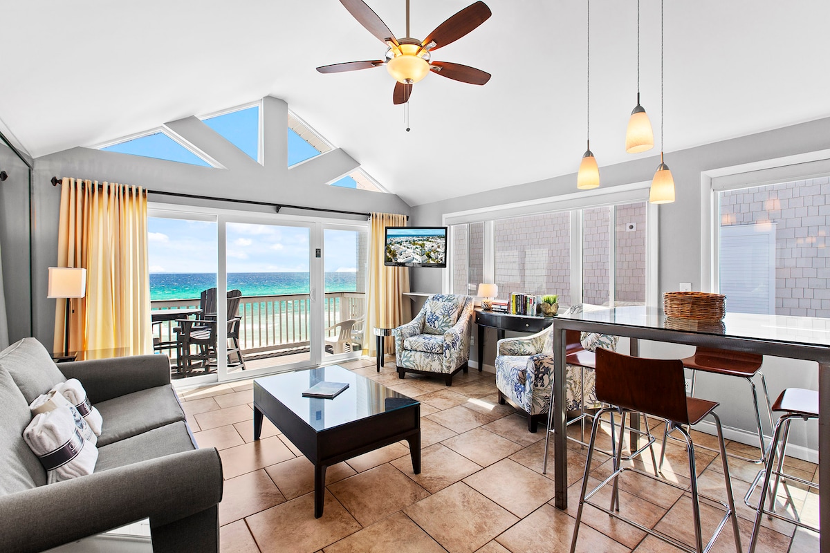 Serenity at Seamist 9 tiene acceso privado a la playa y es una de las 12 unidades de propiedad privada en una zona tranquila en 30-A. Experimenta unas tranquilas vacaciones en la playa en este exquisito condominio frente al golfo. Serás recibido por impresionantes vistas que coinciden con los hermosos detalles turquesas en el alojamiento. Dirígete a tu balcón privado para ver más de cerca las brillantes aguas azul-verdes del Golfo. Toma tu bebida favorita y siéntate en las sillas giratorias de la parte superior alta. El lugar perfecto para contemplar a los delfines
