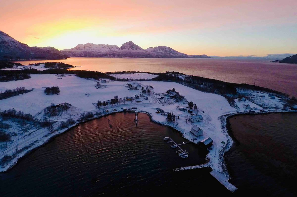 Fantastiske forhold for nordlys, lite lysforurensning. Båt fra Tromsø, Harstad og Finnsnes. Koselig rom med stor seng, to madrasser og baby seng, privat badstue og tilgang til jacuzzi. Delt bad og kjøkken med vert, men også egen kjøkkenkrok. Frokost kan bestilles og serveres til rommet. guidet tur eller guidet isbad i havet. Brøstadbotn er en uoppdaget perle i nord❤️ Rullesteinsfjære, fossefall, merkede turløyper, toppturer med mere.