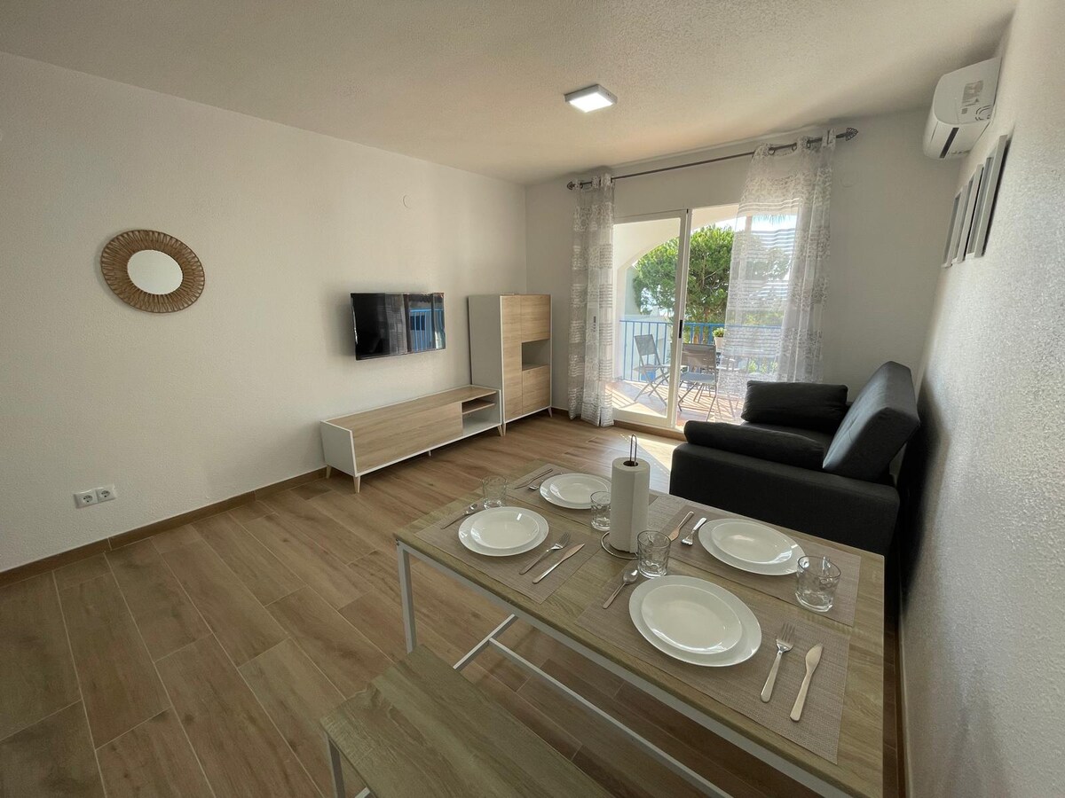 Acogedor apartamento con vistas al mar, en pleno pulmón de la Sierra de Irta. A 4km de Peñíscola y a 1km (10 minutos caminando) de las calas naturales. Lugar tranquilo, idóneo para disfrutar de la naturaleza, las calas, sendas y pistas del parque natural. Ubicado en la Urbanización Los Arcos, de Font Nova, con jardín privado, y piscina y barbacoa comunitaria.