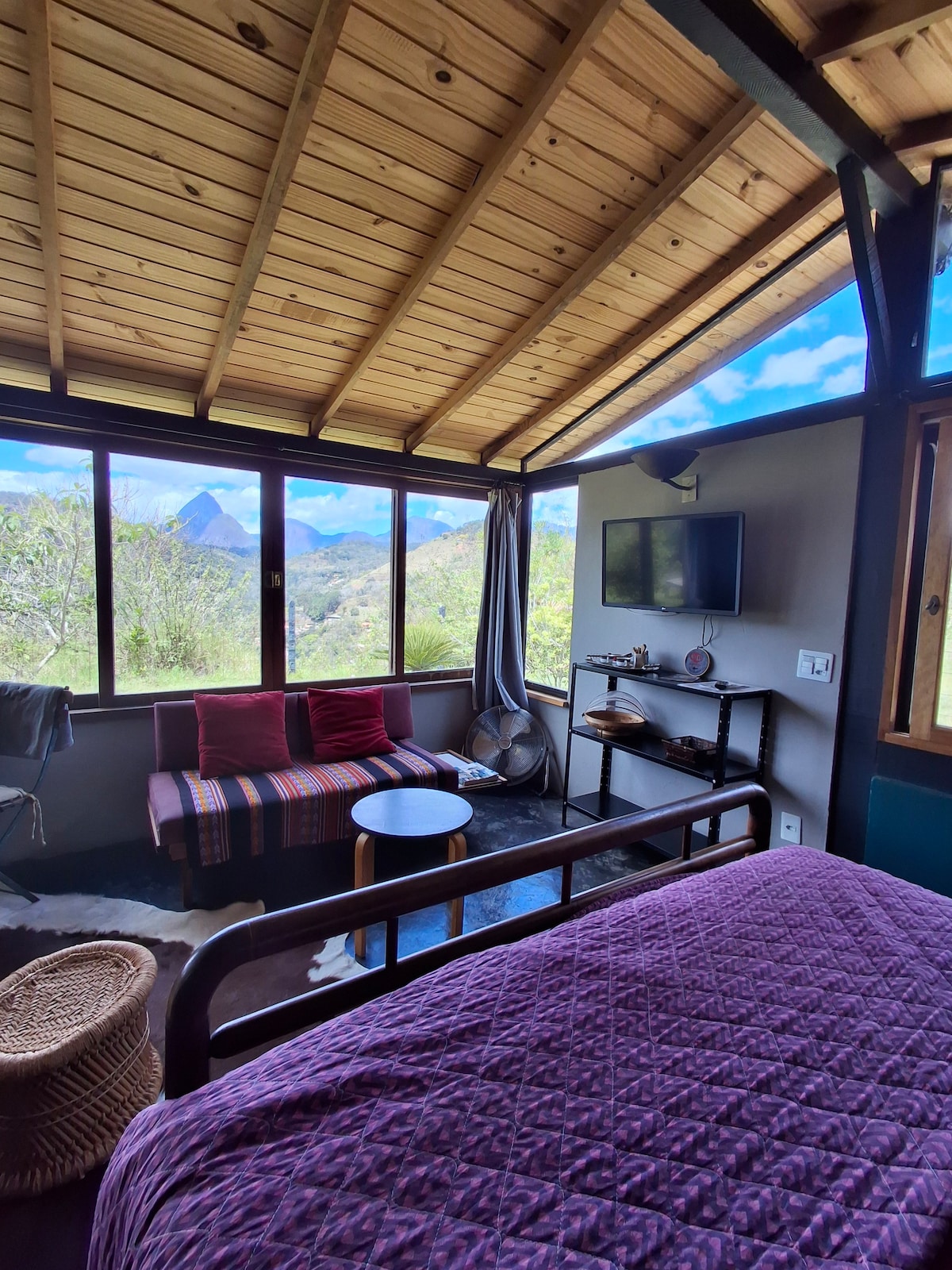 Chalet de montaña, con hermosas vistas, ideal para descansar y disfrutar de la naturaleza. Se admiten mascotas. El chalet se encuentra dentro del rancho Tocas, aislado de la casa principal. Estamos ubicados en el brejal, a unas 2:30hs de Río de Janeiro y a 40 minutos de Itaipava. Bonito clima, frío por la noche, ideal para encender la chimenea. Chalé tiene una suite, una habitación doble y una habitación individual, todas en la segunda planta del chalet. El primer piso tiene un living integrado con la cocina, el baño, el balcón y la pileta.