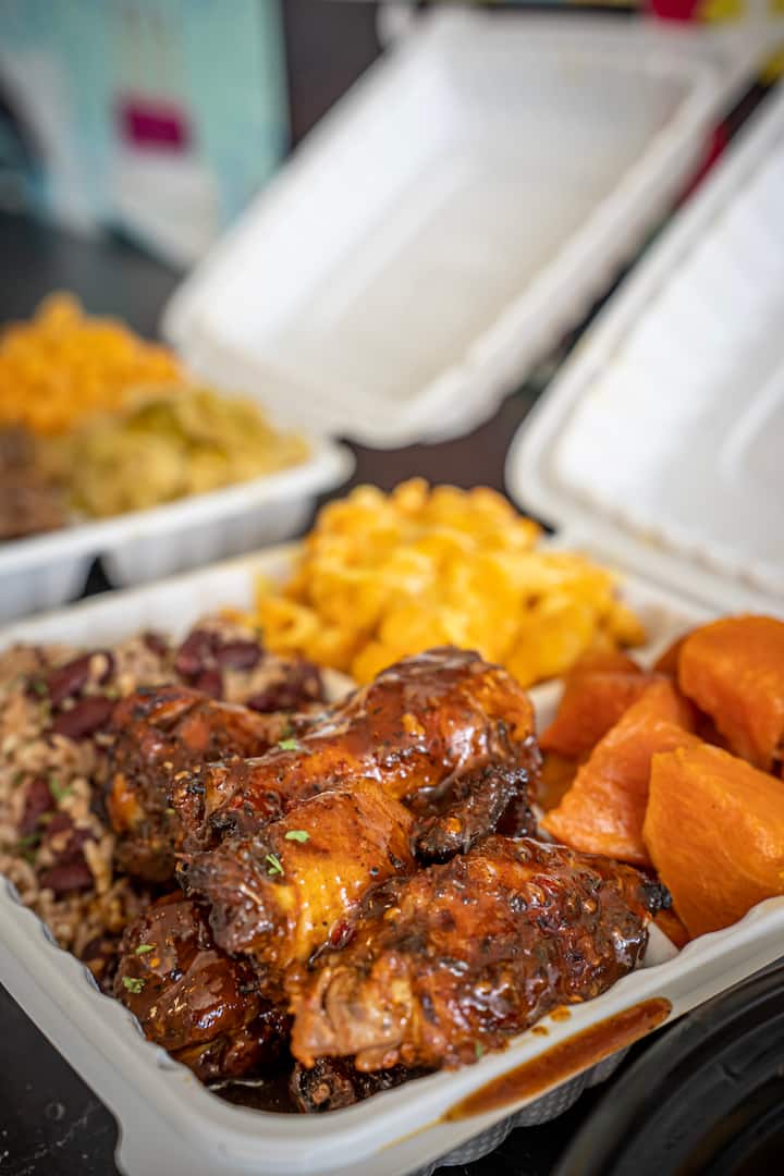 Jerk chicken con macarrones con queso